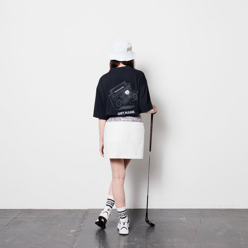 大音量のBOOM BOXにティーショットが打ち込まれて沈黙する、80年代のポップなバックグラフィックをプリントしたセミモックネックシャツ。